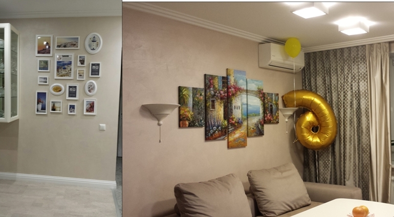 ДД! Мне тоже кажется, что на пустой стене напротив дивана будут хорошо смотреться разноформатные рамки с фото, а над диваном можно ничего не вешать. У меня в гостиной цвет стен немного похожий, рамки с фото очень нравятся, а картина моя как-то не очень. Только извиняюсь за качество фото. Цвет стен на обеих фото одинаковый, это на фото получился разный.