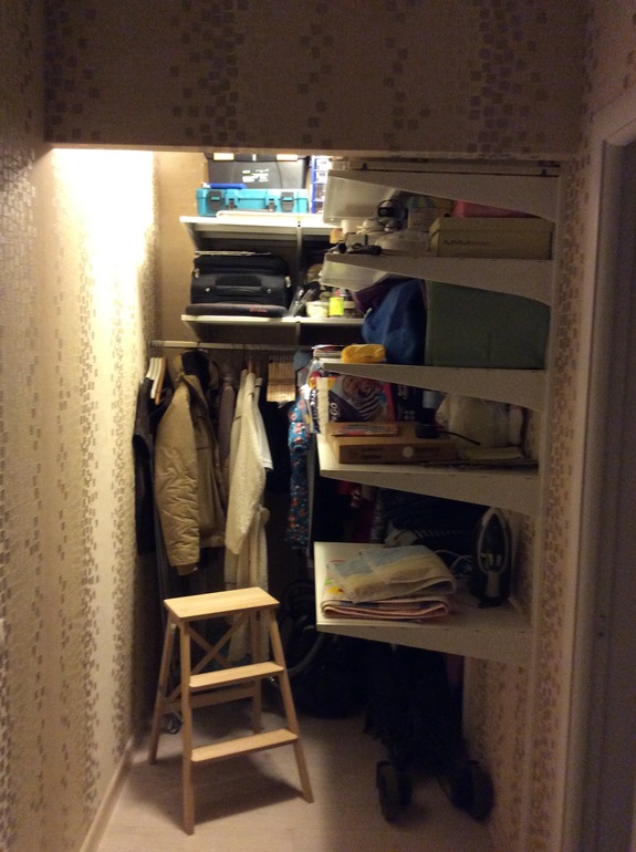 У нас прям , как у вас))В мебельном магазине ,вместе со шкафом купе в коридор, заказали и двери купе-прям от пола до потолка.А внутри укомплектовали кладовку, стелажами железными с двух сторон по стеллажу(1 -для всяких там мужских шурупчиков, дрелей и тд, елка, пылесос. 2-стелаж мы сделали под обувь и верхнюю одежду. )В принципе мы довольны