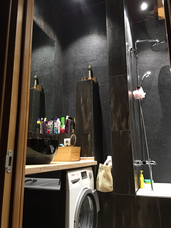 Черная ванная - хороша, я б даже стиралку закрыла, долой светлые цвета :) Кухня тоже очень понравилась! Акцентная стена вообще отличная