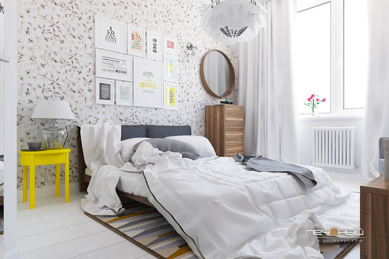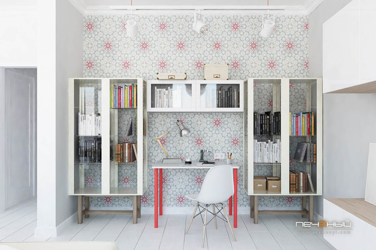 Цветовая гамма - белый, светло серый + яркие акценты. Особенно эту цветовую гамму любит молодежь :) Она создает в интерьере легкую и воздушную атмосферу.