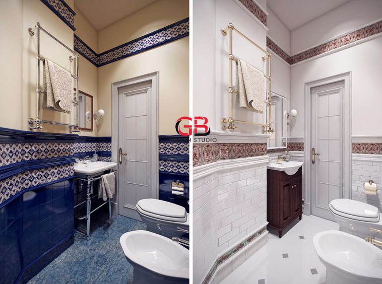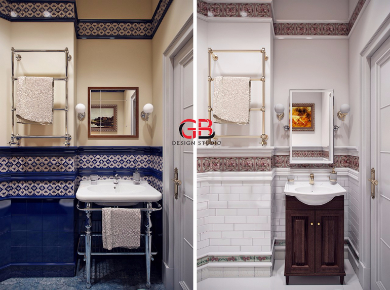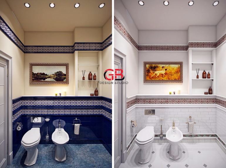 Если вам нравятся белые интерьеры, то правый. Только мне пол не нравится. Я бы сделала по темнее. В левом варианте для меня много синего. Стены нравятся, а пол я бы сделала под светлое дерево и тумбу под умывальником тоже.