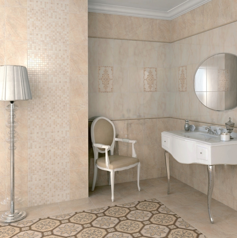 (фото прикладываю). Меня смущает и не очень нравится, как предложили пол выложить. Четыре плитки с декором укладываются в большой квадрат. И вся плитка на полу укладывается под углом. Точнее -укладка под углом не смущает, но вот четыре декора вместе как то...странно смотрятся для небольшого санузла. Посоветуйте пожалуйста какие еще варианты укладки на пол могут быть для этой коллекции.