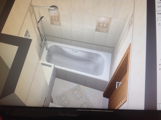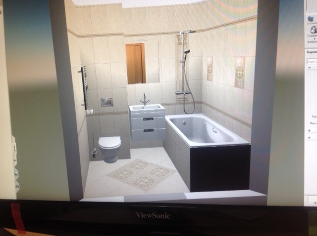 И второй вопрос-как вы считаете -расположение колонн по торцам ванны как смотрится в моем варианте? Мне такое расположение нравится, но почему то в почти всех вариантах укладки плитки, что я видела для этой коллекции колонны располагают вдоль длинной стороны ванны. Добавлю , еще что большой штанги для душа (что нарисована ) может и не будет. Может обойдемся короткой штангой и лейкой на гибком шланге. Шкаф-пенал тоже пока не решили будем ставить или нет, но дизайнер нарисовала. Прошу совета и критики. Спасибо.