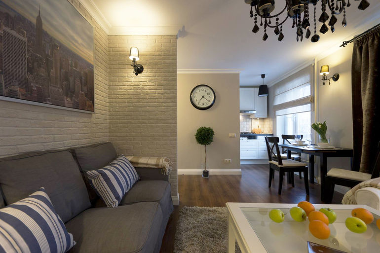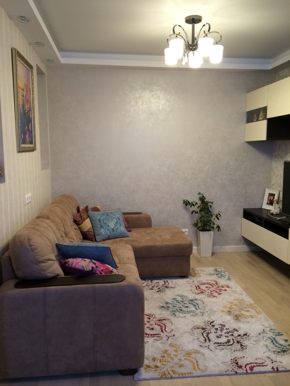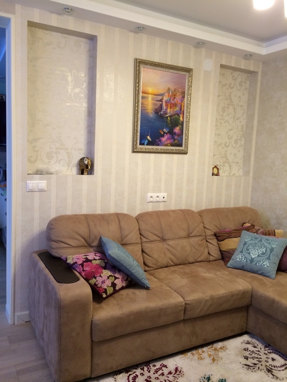 А если действительно всю стену за диваном вместе с нишами сделать под штукатурку, без картины. Вензеля совсем плохие? А стену с вензелями всю переделать при возможности под кирпич, его и из кухни будет видно. Но диван и шторы точно менять не буду, так как все новое и стоит недешево. Хочется с минимальными затратами подредактировать то, что имеется. Муж и так не понимает, чего я тут мудрю, а мне не нравится.
