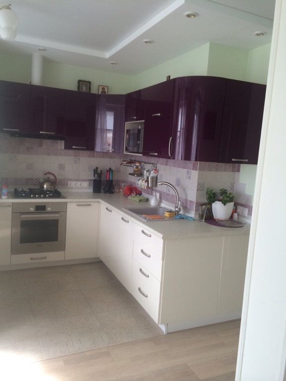 А еще видно кухню за стенкой за диваном, поэтому картиной пыталась как-то увязать кухню и цвет текстиля в комнате, видимо не очень удачно.