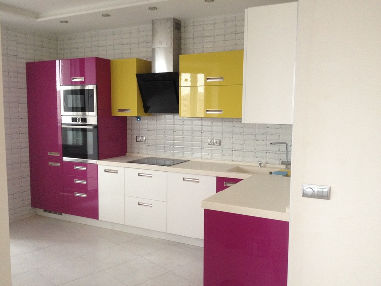 Заказывали кухню осенью. Может по цене не бюджет, но в паре других салонов нам насчитали примерно такую же цену за пластик. Мы взяли эмаль модель кухни "Юрио".
