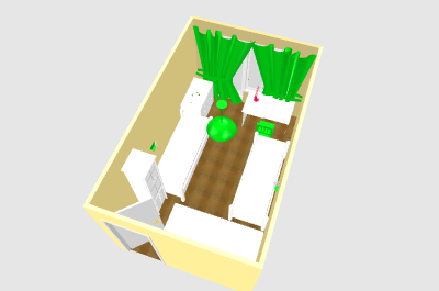 У меня с братом в комнате такая же расстановка была: кровати напротив друг друга, шкаф у двери, письменные столы у окна, мне очень нравилось, у каждого своя равная територия, вечером можно поболтать, середину тоже чертили, когда каждый свою часть пылесосил )). Своим детям буду также делать.