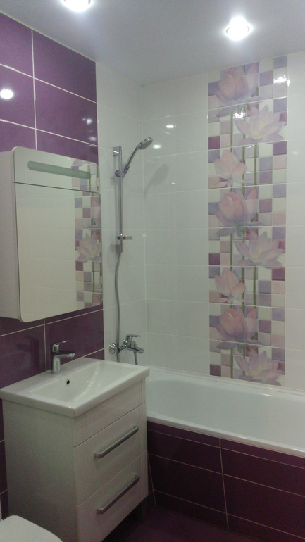 У нас стык ванны и плитки отделан керамическим уголком (ванна стальная). В самом начале ремонта я хотела акриловую ванну, часть крыла утопить в стене и плитку начать выкладывать непосредственно от бортика ванны. Но в итоге купили стальную ванну и положили керамический уголок. Потолок натяжной, стык отделан спец. резинкой к натяжным потолкам.