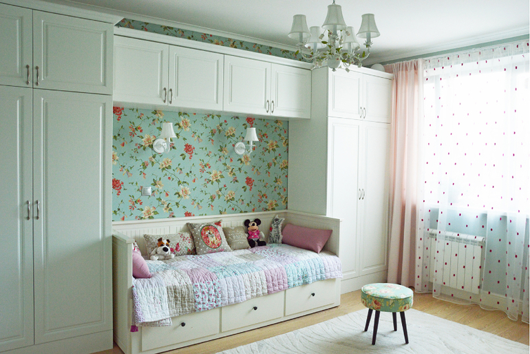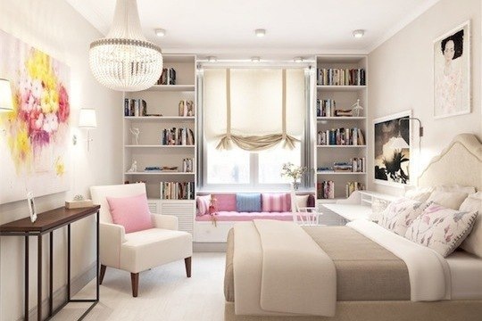 Комната такая, 14 м, солнца почти не бывает, обои очень светлые бежевые, мебель вся белая