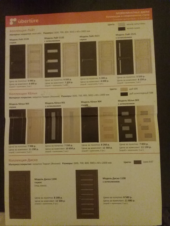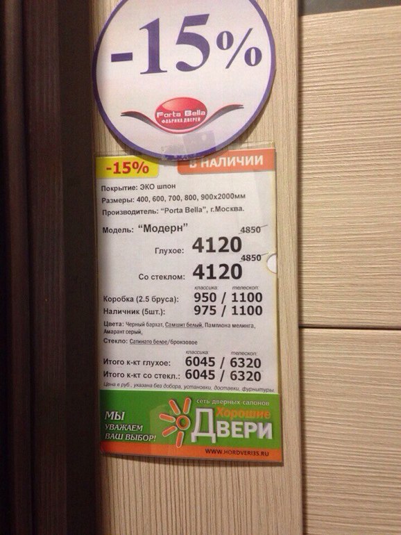 Мы брали дешевые двери,выглядят солидно,точно не помню,кажется эко шпон.Брали в фирме хорошие двери.У них скидка 5%кажется по пенсионному или карте забота.У нас,если что есть и просто карточка на скидку.Двери есть очень бюджетные,но кромка если пластиной,то она 100%отвалится.В этот раз взяли двери в обяжке,гораздо лучше.Причем двери визуально одинаковые(зависит от фирмы)стоят 3-4тыс полотно и 1500полотно,Разница существенная)