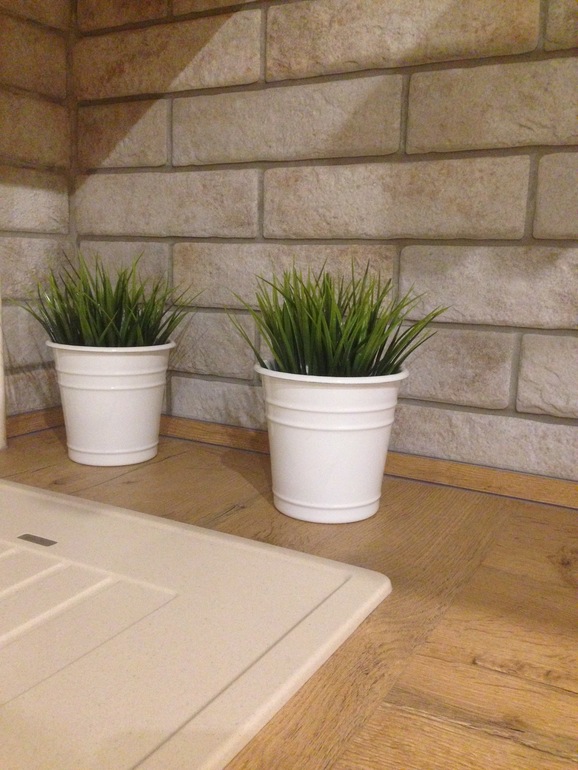 У меня стена белая кирпичная около обеденного стола из искусственного камня. Если бы фартук сделать таким материалом и цветом то боюсь чистым он бы был не долго. Если кирпич не маркого цвета то можно было бы рискнуть.
