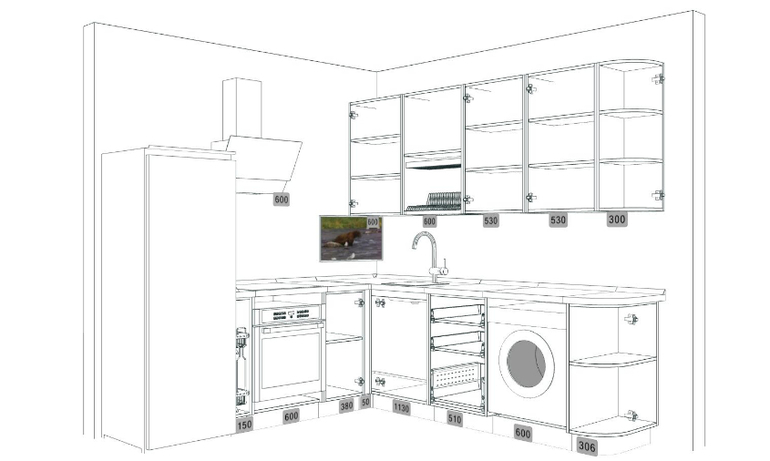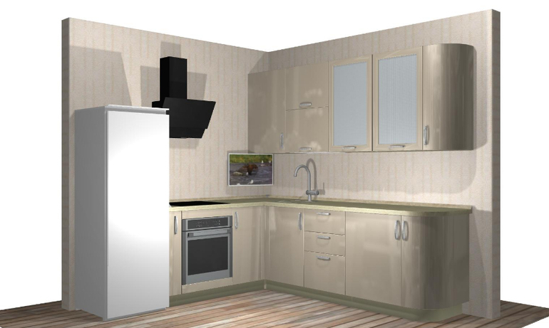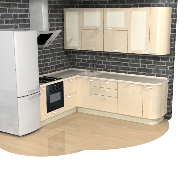 P.S. Добавила еще картинку с планировкой, для понимания расстановки. Холодильник будет стоять по диогонали от входа, в углу у окна . Справа от входа на кухню радиусный фасад.