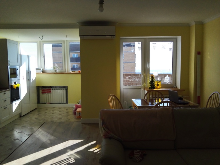 Вопрос вот какой: каким образом повесить эти гардины слева? Там лоджия полукругом. Напротив холодильника хочу еще кухню заказать, просто 3 шкафчика под овощи, мелкую технику. Гардины можно повесить до пола с прихватом (крепление багеты к потолку) или сделать короткие какие-то (крепление к самому окну). Подскажите, девочки.