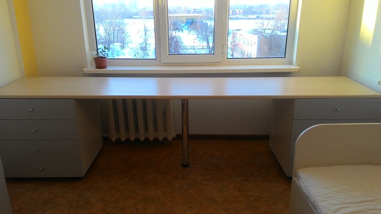 классно а вещевой шкаф есть? у меня тоже большое окно в детской хочу тоже такой стол на двоих но еще пеналы по бокам