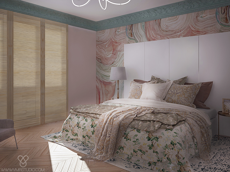 Спальня получилась уютная, воздушная...одним словом - зефирка :) Напольный и потолочный плинтуса выкрашены в цвет акцентной стены в гостиной комнате, а обои за кроватью повторяют рисунок тех, что в гостиной, только цвет мы выбрали более подходящий для их спальни :)