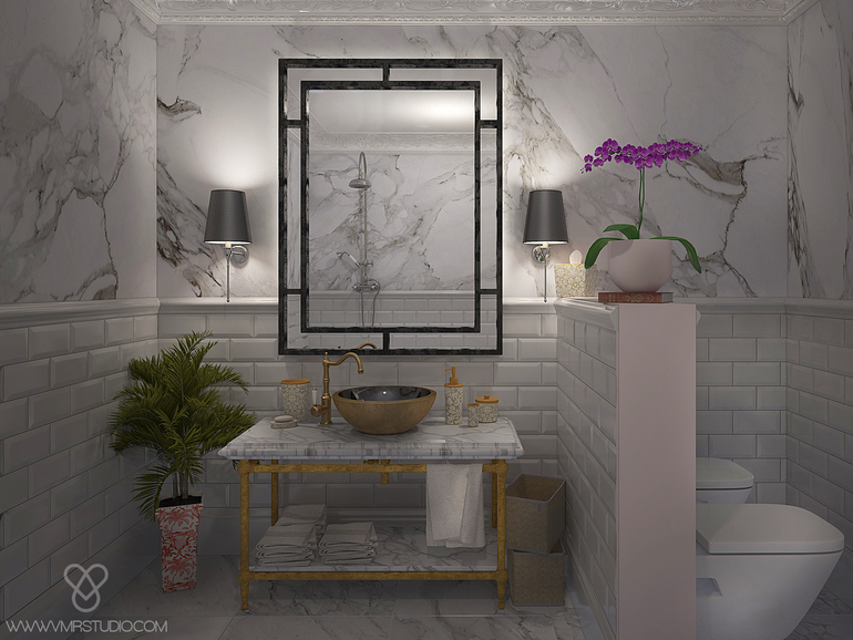 Санузел с приглушенным светом. Мимо классического смесителя и душевой стойки никак не смогла пройти и использовала в интерьере. Основная зона для мрамора была эта, собственно, санузел... однако Вы можете заметить его локально в каждом помещении квартиры, он не навязчив, но придает интерьеру легкость и подчеркивает нежность. Всеми любимая плитка метро /многие называют ее кабанчиком, однако кабанчик - это немного иная плитка, кому интересно очень рекомендую почитать историю этой плиточки в интернете/ так же нашла свое место в нашем санузле :) Перегородку возвели намеренно, унитаз и биде спланировали в другой части санузла, нежели было до ремонта, перегородка зонирует пространство, добавляя милую полочку сверху :)
