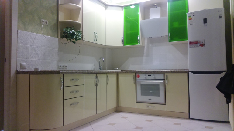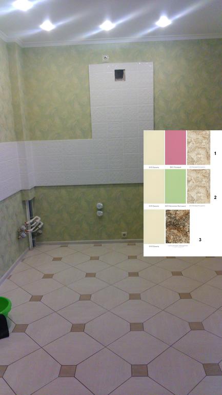 Я бы всё кухню сливочного цвета заказала или белую,ИМХО - зелёного и розового слишком много.