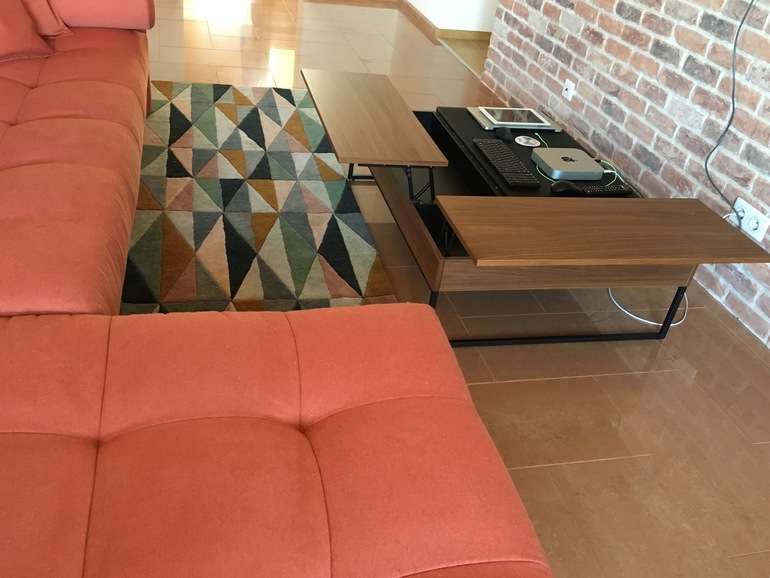 3. Столики, полки и тд. Я категорически против полок. Так как каждая горизонтальная поверхность это дополнительная пыль, а раба дома у меня, к сожалению, нет. Все роутеры, плейстейшн и прочие аксессуары в моем случае - за стеной, там находится кабинет. Вся техника живет там. Телевизор на стене висит временный (из детской) поэтому торчат провода (просмотры фильмов через Мак Мини). Тут будет висеть телевизор со Смарт ТВ. Столик очень удобный с поднимающимися полками. Очень удобно пить вино за просмотром фильма, ну или вечерний детский перекус - кефир и печеньки.