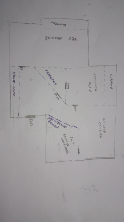Интерьерные штучки.Купили квартиру в долевку на последнем этаже. Застройщик идет на встречу и сделает небольшую перепланировку, но без координального изменения месторасположения комнат. Я набросала приблизительный план. Карандашом-это, то, что есть, а ручкой- это моя корректировка. Посмотрите, пожалуйста, может будут идеи получше))