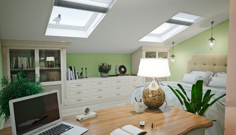 Нельзя спальни располагать в таких помещениях ввиду того,что наклонный потолок нарушает симметричность потоков Инь-Ян,а отсюда прекращение засыла мыслей в Небесный сервер,что приводит к неудачам и болезням.