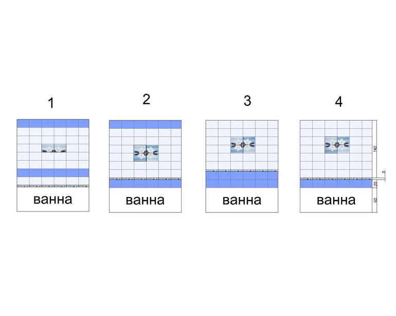 А на стенах без ванной на уровне ванны какая плитка будет идти - голубая или белая? Если голубая, то 3 или 4 вариант (особо принципиальной разницы между ними не вижу). Если белая, то 1.