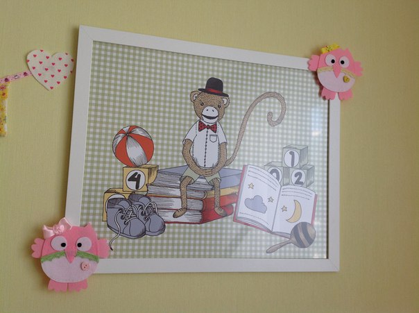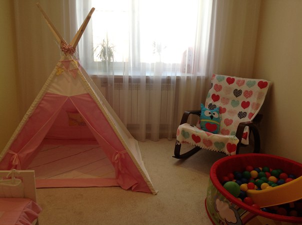 Кроватка и стеллаж ИКЕА. Больше из мебели ничего нет. Столик детский тоже ИКеа стоит в гостиной. Ремонт делали 3 года назад. Обои светло желтенькие на 3 стенах, а вот на другой, где кровать с веточками оливково желтые, их я мечтаю поменять. но пока нет возможности. На полу ковролин, комната самая холодная в квартире (хотя мы ее утеплили). Дочка все время сидит на полу, решили положить ковролин, не жалею, мы его не приклеивали, а просто под плинтусом прикрутили в 2 местах, чтоб летом можно было его в химчистку отдать. Года через 4, перед школой будем делать ремонт, тогда и обои, и потолок (который тоже мне не нравится), и ковролин поменяем на паркетную доску. Люстру до сих пор не купили. Шторы тоже. Вот хотела совета еще спросить, хочу желтые шторы, что скажите? или может какой другой цвет? Покрывало, подушки, вигвам, алфавит (висит рядом с мольбертом на стене) , флажки на стену и растяжку с совами шила сама (насмотрелась на красоту в сообществе рукоделие и решила попробовать себя в шитье). На стене, где бассейн с шариками пока пусто, хочу купить штучки 3 полки-домики и повесить их.