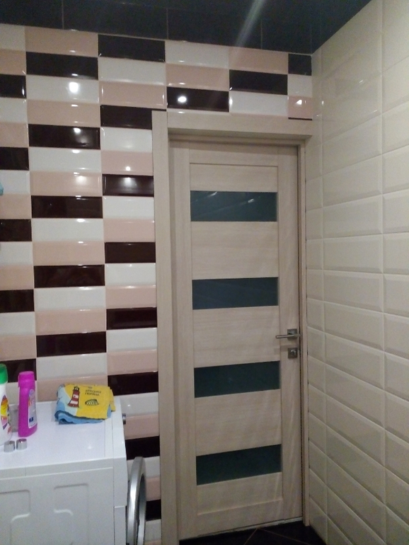 Я бы такую эффектную раскладку, как у двери, сделала бы на белой стене над ванной, а около двери просто белую. Заходишь в ванную - и Ах!!! :)