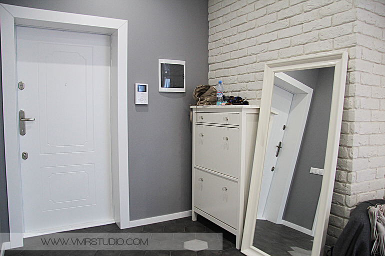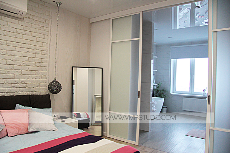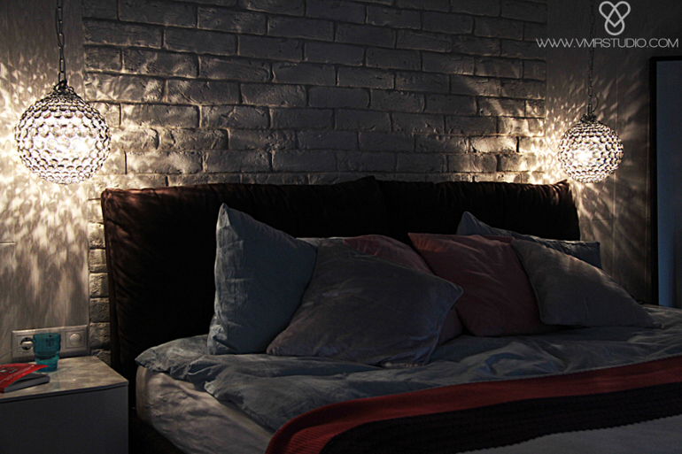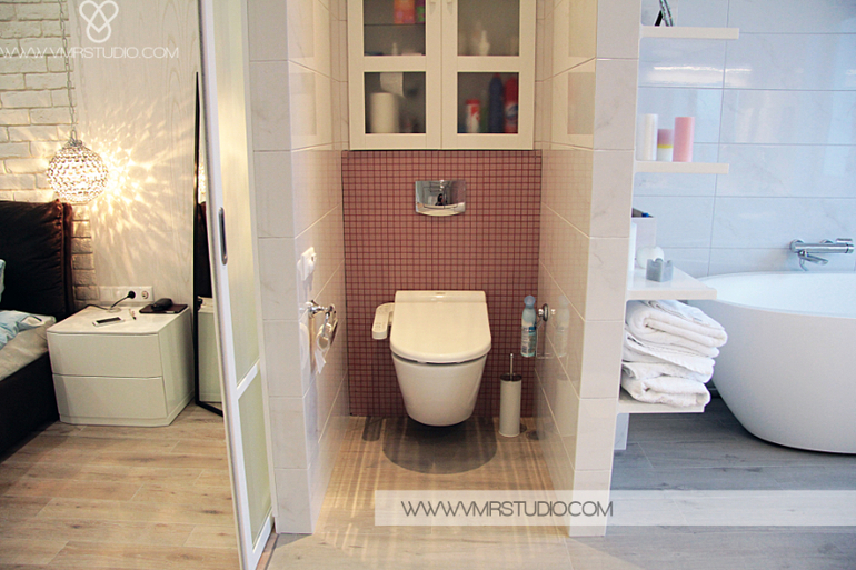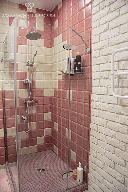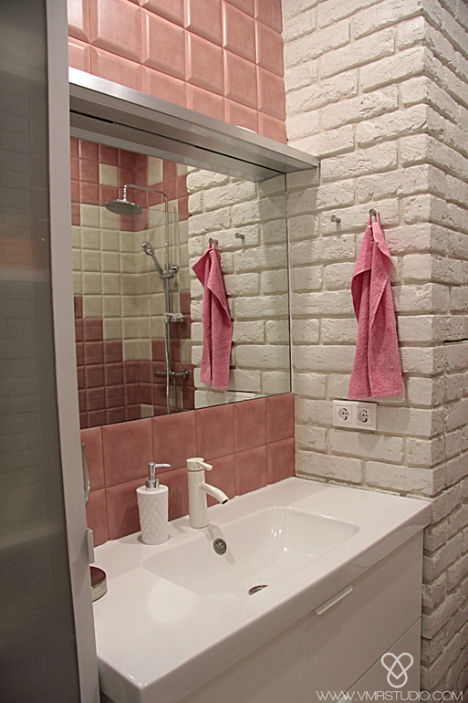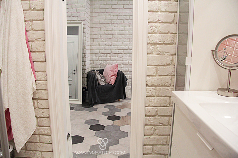 Гостевой санузел хоть и без окна, но тоже довольно милый и нежный, а объемная настенная плитка делает его даже мягким :), обратите внимание на ее раскладку в зоне душевой кабины ♥, так же тут Вы можете заметить декоративный кирпич, который прослеживается в прихожей, спальне и на балконе.