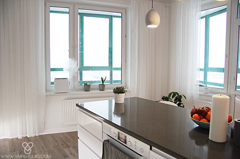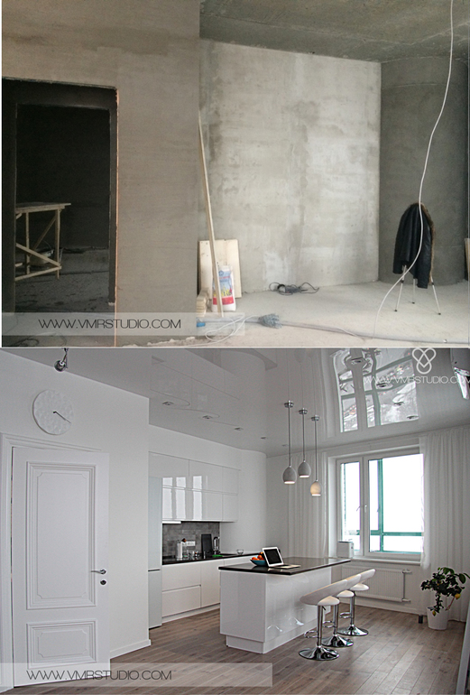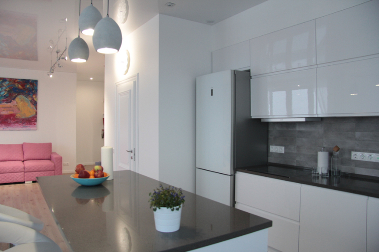 Парящая кухня выполнена нашими партнерами, фасады которой эмаль по RAL , а столешница натуральный камень. Остров приметила женская сторона наших читателей, статистика показывает, что о нем мечтает каждая хозяйка :) Нашей Заказчице его хватает, обеденный стол не нужен, а в гардеробной хранятся запасные барные стулья для гостей. Бетонные светильники над островом поддерживают фактуру фартука, керамогранита в прихожей и на балконе. Радиусная стена не останется пустой, скоро на ней появится что-то очень необычное :) Как только, так сразу добавится на сайт.:)