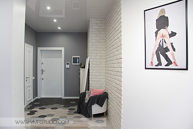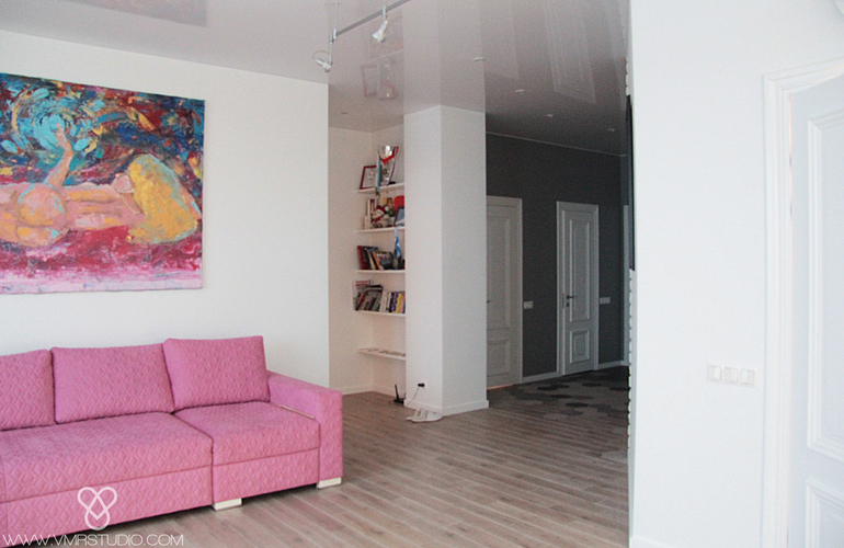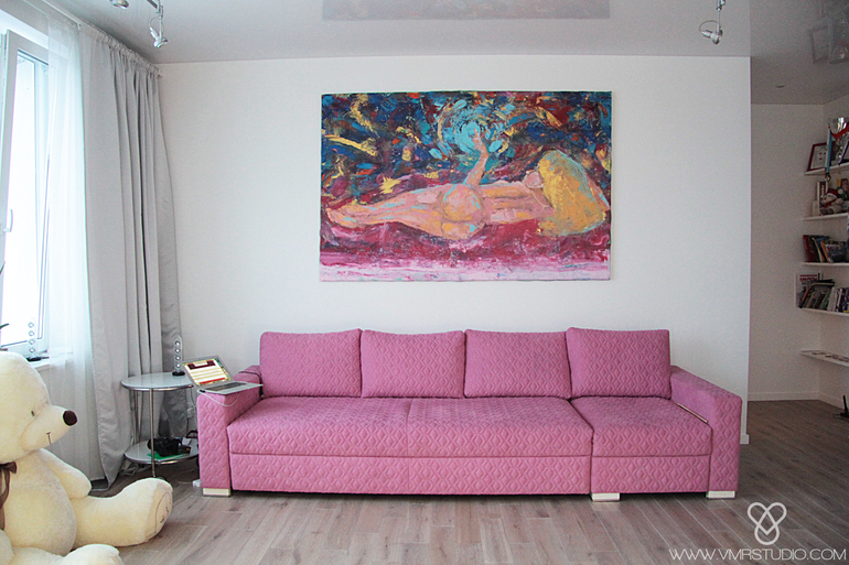В гостиной еще нет журнального столика, но мы расскажем Вам о картинах, расположившихся в большом пространстве этой квартиры :). Большое произведение обнаженной девушки написал Заказчице ее друг-граффитчик, она является центром композиции этой зоны. А произведение прекрасной художницы, которое Ваш глаз зацепил среди всех фотографий 100%, хоть немного и пошлое, но очень стильное и красивое, прекрасно вписавшееся в общий интерьер, не так ли?