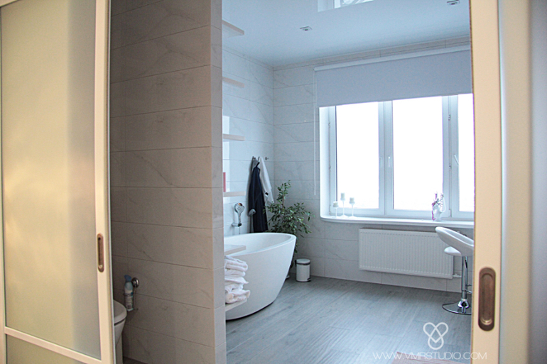 Самое интересное в этой квартире по расположению - это хозяйский санузел, площадь которого 13 кв.м, а ширина окна 220см - мечта многих пожалуй... тут есть и отдельно стоящая ванна и душевая кабина, что очень удобно. Унитаз отделен перегородкой, что не стесняет и оставляет вид такого санузла эстетичным. Открытые перегородки, ведущие в санузел, добавляют интерьеру спальни неповторимый вид, такое подойдет далеко не всем, только смелым, рисковым и стильным людям, которые не бояться нового и готовы отказаться от стереотипов и комплексов.