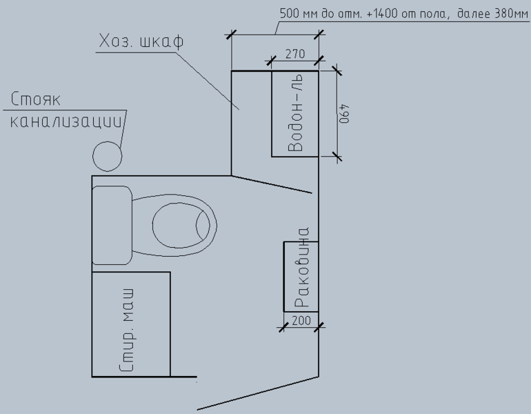 Нужно поместить туда стиральную машину, водонагреватель (именно такого размера), раковину и унитаз. помогите с расстановкой, пожалуйста. На бумаге могу много вариантов нарисовать и все вроде нравятся, а прихожу в квартиру и на месте все никак не определюсь с удобным расположением. Последние 2 были такие 1.