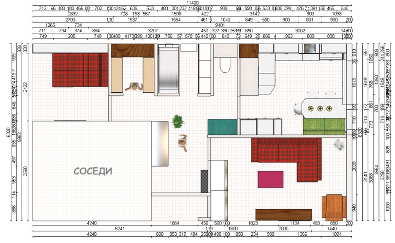 Стену между кухней и гостиной уже возвели, но не так, как было изображено на проекте у застройщика, там кухня получалась совсем маленькая, а перенесли ее в сторону гостиной, соответственно, уменьшив ее. Но из-за этого не переживаю: гостей будем встречать на кухне и там же будем проводить большее количество времени. При входе на кухню справа хочу сделать пеналы под встройку и там же разместить холодильник. Сейчас задумка примерно такая (на расстановку мебели и цвета не обращайте внимания):