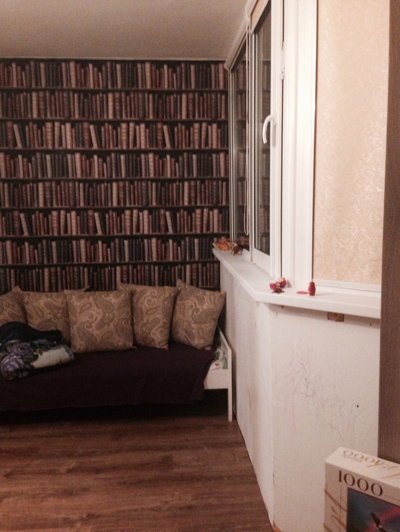 7 кВ м, кровать детскаЯ икеа( стоит ждет своего часа) обои как книжный шкаф, плинтус так и не прибили, руки не дошли. Тоже любим чаи распивать утром! У нас там теплый пол и пользуемся зимой!