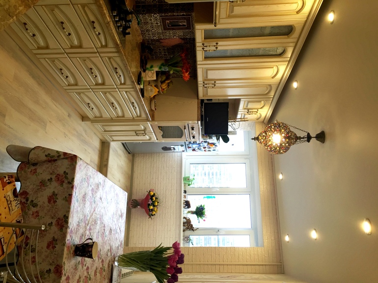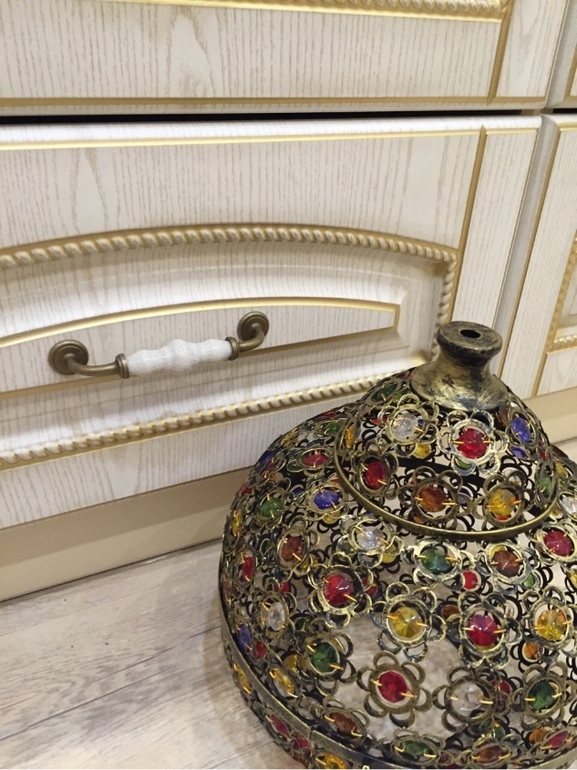 Фото не очень по цвету, обои на стене с розовым оттенком. Стиль не подходит, я знаю, но мне захотелось именно эту люстру. Штора будет между кухней и балконом, как декоративный элемент.