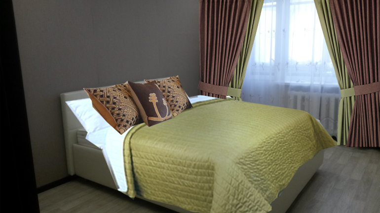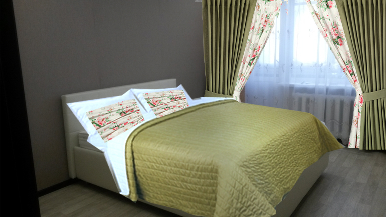Интерьерное решение спальниСделала ремонт в спальне, и теперь никак не могу определиться с текстилем. Кровать с подъемным механизмом, оказалась очень высокая, но мне нравиться. Девочки, подскажите какое покрывало сюда подойдет и шторы (сейчас весят старые, их буду меня).Стены молочные и одна стена цвета какао. Мебель будет венге и молочный дуб. Может цвет какой-нибудь добавить?