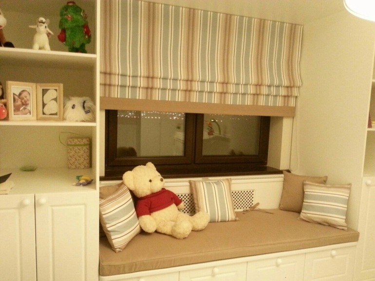Все римская штора, подушки и наматрасник сшиты из двух видов хлопковых испанских тканей, поскольку лучшие детские ткани - это испанские. Все обошлось в 30 тыс.