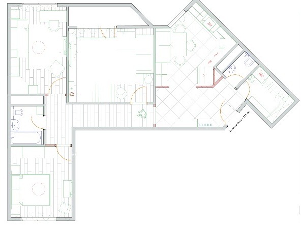 Вот окончательная планировка , которую выбрали. Со спальней и детской для девочки было все понятно, а вот гостинную и кухню крутили долго.