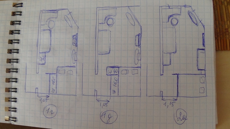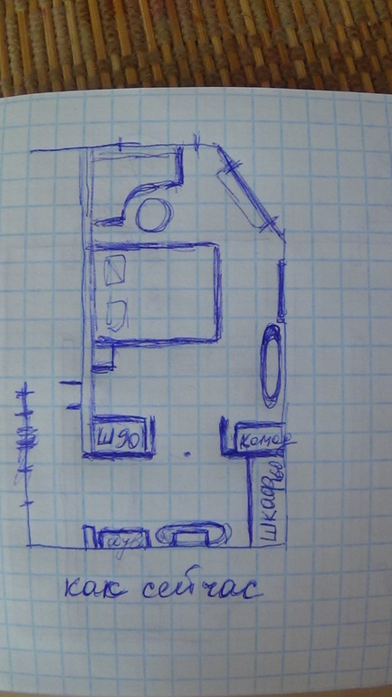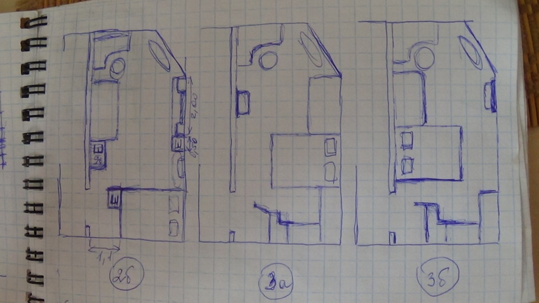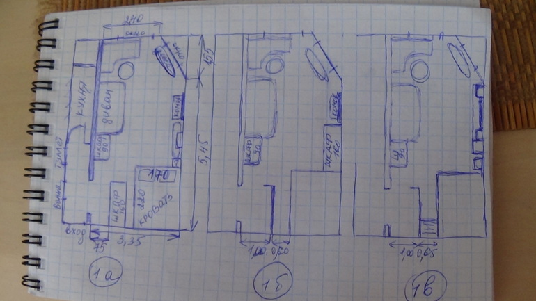 Стена между комнатой и кухней капитальная, ее сносить нельзя так же как и выступ при входе. Мебель хотим оставить ту же в идеале ,но если будет хороший проект, то можно и поменять мебель. В комнате эркер и 2 окна. Окна выходят на юг, эркер на юго-запад. Стена при входе 40 см. Брат живет один, пока не женат, но сейчас второй брат временно (насколько неизвестно) живет с ним, спит на кухне на маленьком диванчике, телек там не влезает, поэтому гостиная только в комнате. Простите за рисуночки от руки. Все варианты нарисовала какие придумала. Брат сам придумал вариант 1д, пространства много, но я отговариваю, так как душно и неудобно будет в нише кровать. Во всех вариантов есть достоинства и недостатки, но брат хочет кровать максимально убрать из центра комнаты освободить пространство. Вариант 1в и 2б с другими шкафами. Подскажите, пожалуйста, какой вариант лучше, или какой взять за основу и что-то поменять, или может что вообще другое придумать, хотя бы основные моменты без мелочей можно.