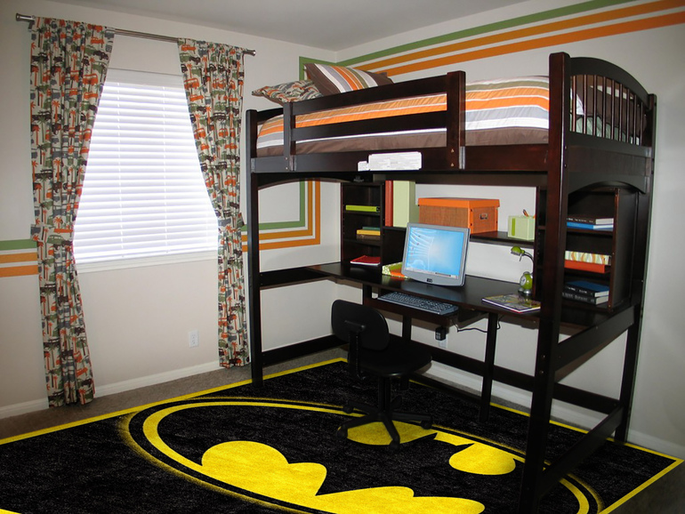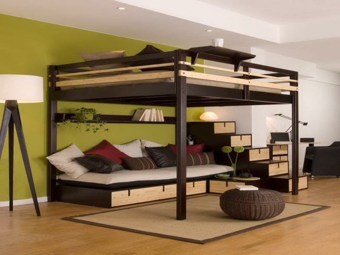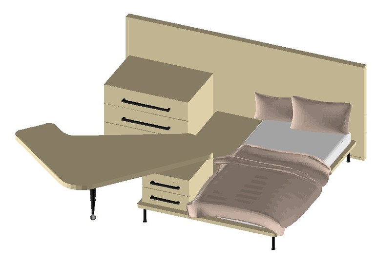 Подобных вариантов много, как односпальные, так и двуспальные кровати. Можно купить или сделать на заказ. Поставить можно как на варианте "1". В этом случае два наиболее громоздких объекта объединяются, освобождая пространство.