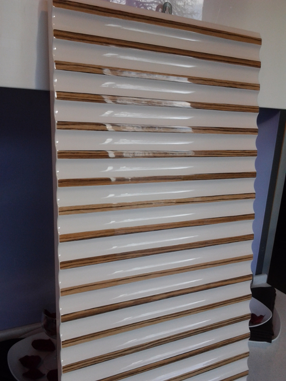 Глянцевая эмаль с вставками шпона акации, на которой отпечатки тоже не видны, наверное из-за рельефа. Эти фасады предполагается чередовать с фасадами аналогичного цвета, но гладкими и без вставок шпона.