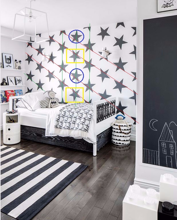 На рисунке виден шаг рисунка. Красными линиями выделила диагональ.Зелеными там где совпадают вершины. Надо вырезать из картона одну звезду. В синем круге звезда повернута в одно направление, в желтом квадрате в другое направление. Надо просто обрисовать, малярным скотчем тщательно залепить края и красить)