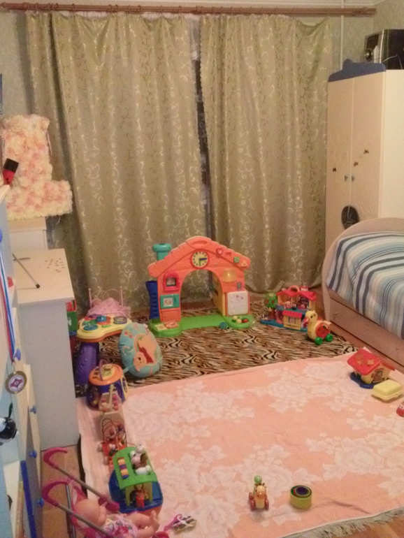 Конечно, в идеале (моем идеале)- это комната с зеркально установленными детскими уголками (кровать/ шкаф/ письменный стол). Но в нашей ситуации для дочери это все еще рано, ей бы стеллажи и еще раз стеллажи для игрушек, пространство для кухни, магазина и т.д.