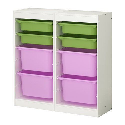 Икеевские стеллажи тоже могут выручить - они мобильны, их можно разъединить и переставить при желании, они могут быть высокие, чтобы вместилось как можно больше. Высота стеллажей опять же позволит уйти вверх и разделить игрушки: вверху для взрослого, внизу в доступе - маленькому. Не ящики, а корзинки - безопасно для пальцев.