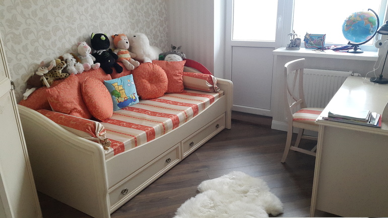 Мебель фабрика Прагматика, серия Прованс. Дочка много времени проводит в комнате, игрушек сейчас не много, оставили многое в другой квартире. Вроде хватает места для игр. Тем более у нее любимые игрушки - маленькие пони. Остальные игрушки стоят в шкафу в ящике. В другой квартире у нее то же была такого же размера комната и в принципе все на хранение помещалось, но если что то надо было разложить масштабное, она в нашу комнату приходила играть. Но сейчас уже выросла, думаю такого количества игрушек у нас уже не будет.