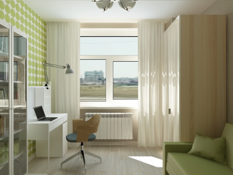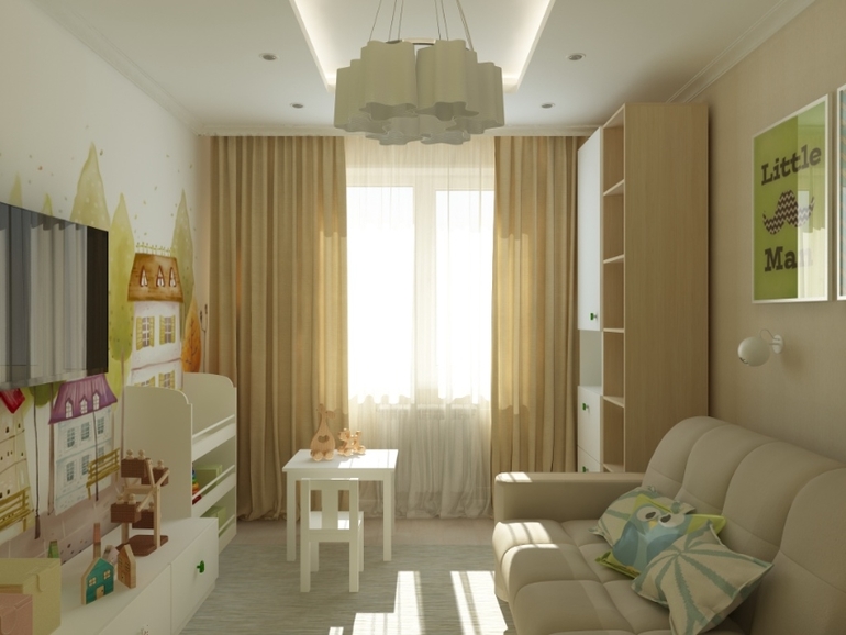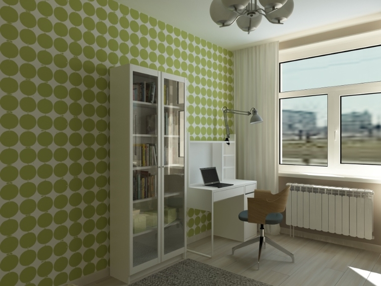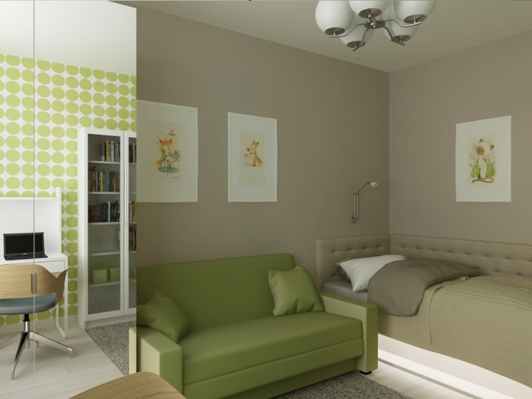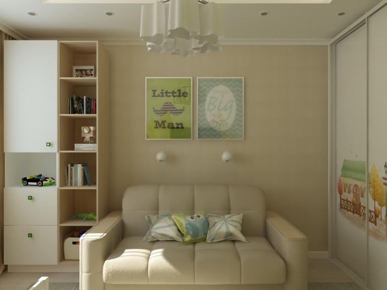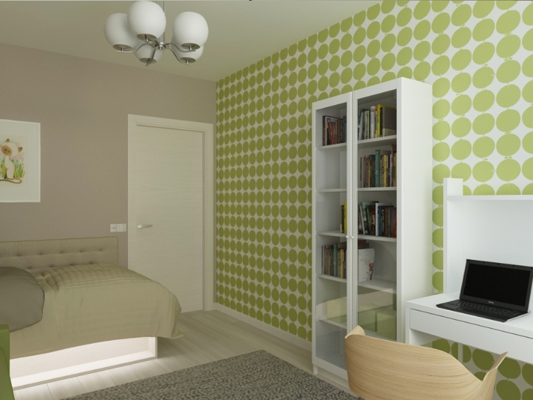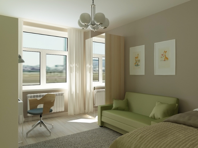Здесь были использованы бежевые, салатовые обои, фотообои и фотопечать на дверях шкафа одной тематики. Следующий проект заполнен почти полностью предметами из Икеа)