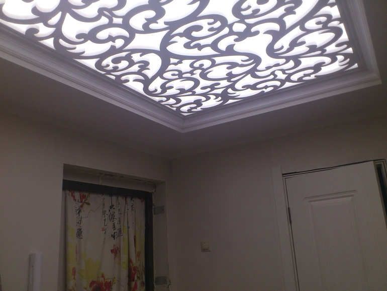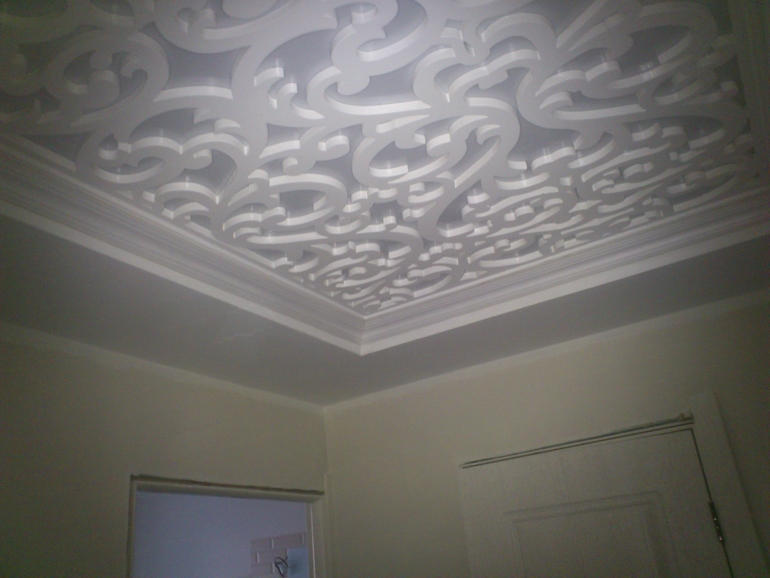 У нас такой с резной мдф перегородкой. Фото еще недоделанного. Плинтуса еще одного не хватает по стене основной, а внутри плинтус не покрашен. Света очень много от такого потолка, на фотке сфокусировался фотоаппарат на лампу, поэтому остальное затемнилось