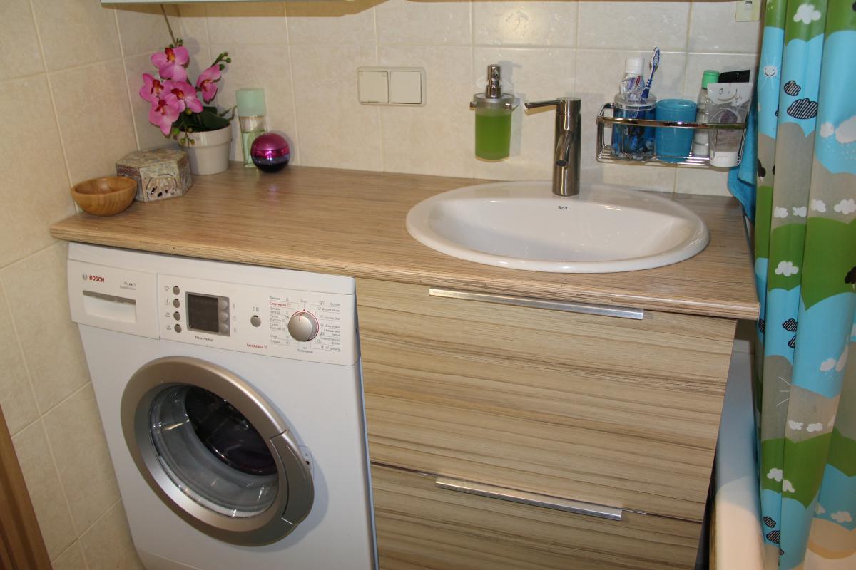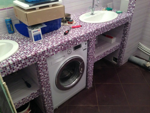 у нас дома так, большая столешница белая, в нее врезали раковину, под раковиной корзина для белья, машинка под столешницей (сбоку), не под самыми ногами. Мне очень удобно.