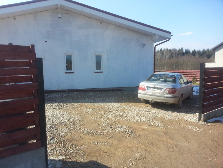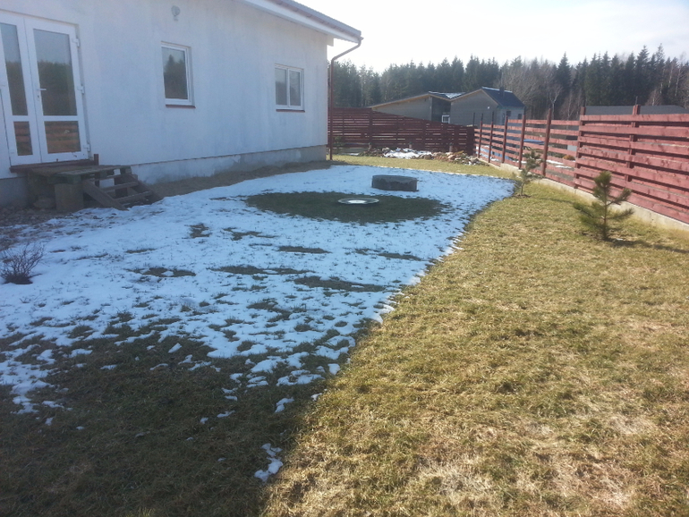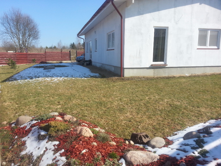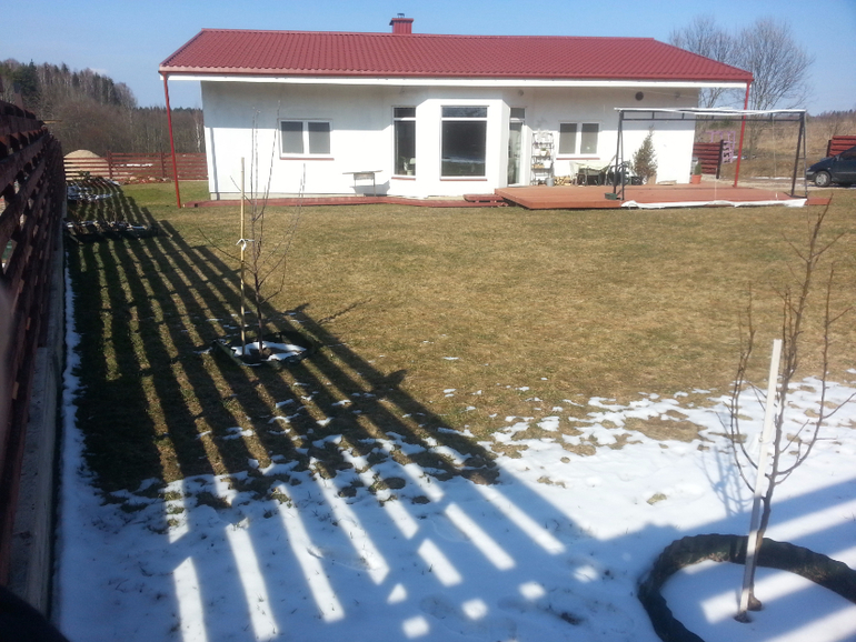 северная сторона, уже посажены сосны, кустарники цветущие, и в этом году будет делаться вход с терасой в дом,