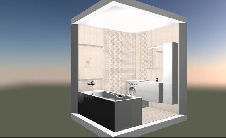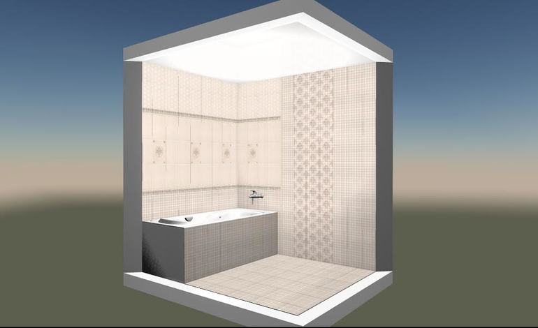 Если совмещать горизонталь/вертикаль, то делать отбивку объемником вертикально, сейчас получается, что его выпуклый торец будет некрасиво смотреться. Потом слишком всего много. Больше напоминает выставочный стенд в магазине, а не ванную. Выберите для себя пару декоров и из них делайте раскладку. Поверьте, лучше меньше, но изысканно. Кстати, и экономичнее))